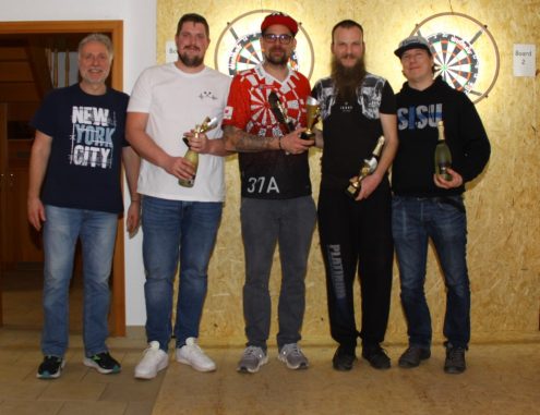 48 Teilnehmer waren am Start und kämpften sich in 6er Gruppen durch die Vorrunde, die auf den 5 Scheiben nach 6 Stunden gegen 22 Uhr beendet war. In einem spannenden Endspiel, das erst weit nach Mitternacht begann, setzte sich Schlaubi gegen Denis mit 3:2 Sätzen durch. Das Niveau der Spiele wird von Jahr zu Jahr höher; so waren einige „180-er“ zu sehen. Das Spiel um Platz drei entschied Donath (gegen Jörn) für sich.